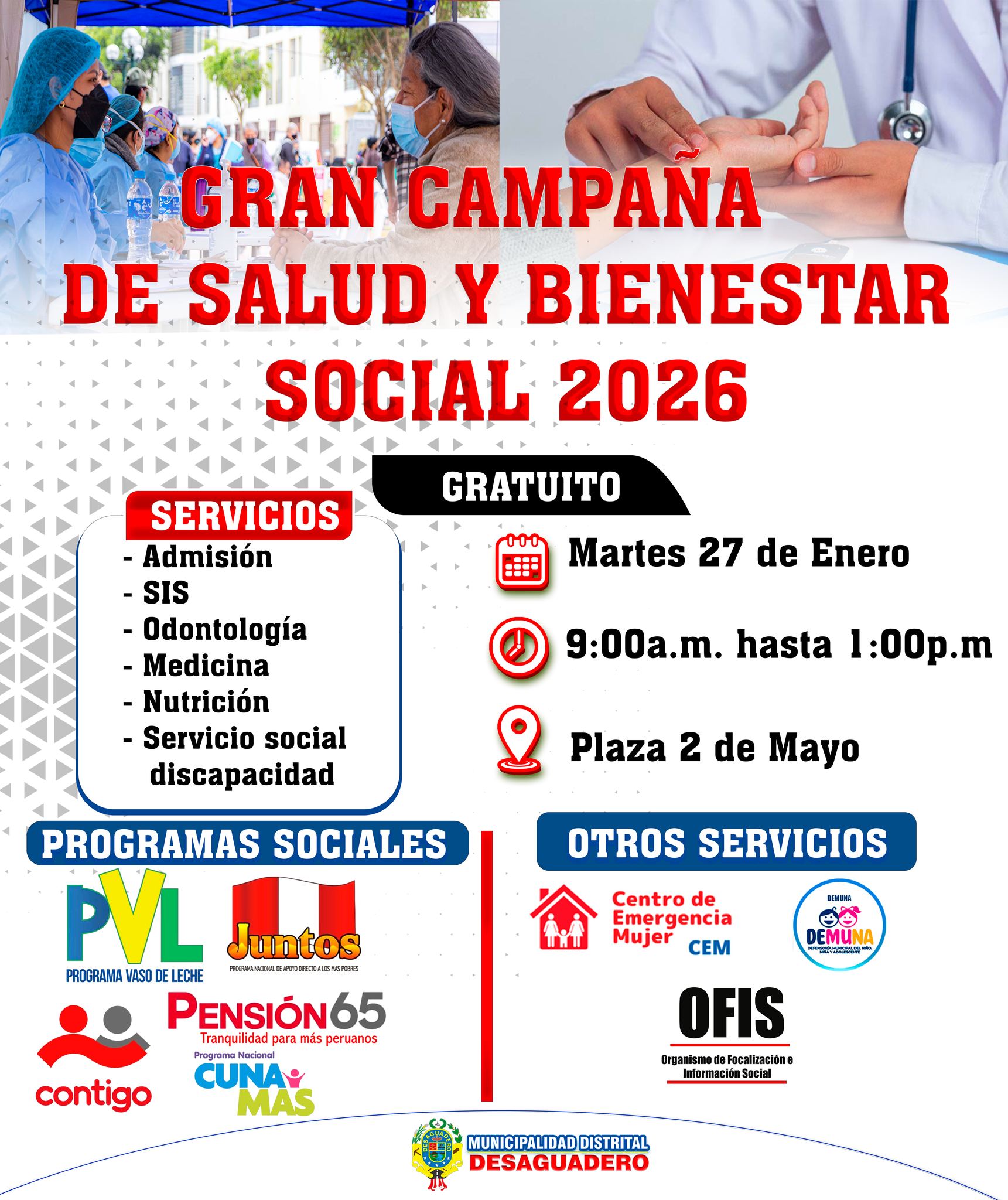 Continuando con el cuidado de tu salud, la Municipalidad Distrital de Desaguadero, en coordinación con el Centro de Salud y EsSalud, realizará una jornada de atención conjunta con los diferentes programas sociales.