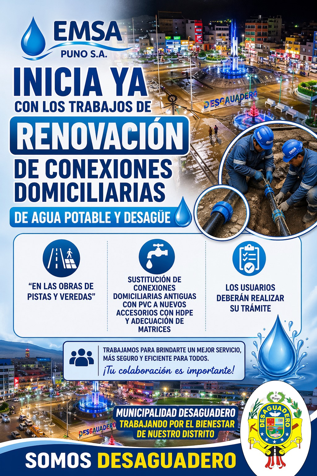 π La empresa EMSA Puno S.A. iniciΓ³ los trabajos de renovaciΓ³n de conexiones domiciliarias de agua potable y desagΓΌe en el distrito de Desaguadero, como parte de las obras de mejoramiento de pistas y veredas.